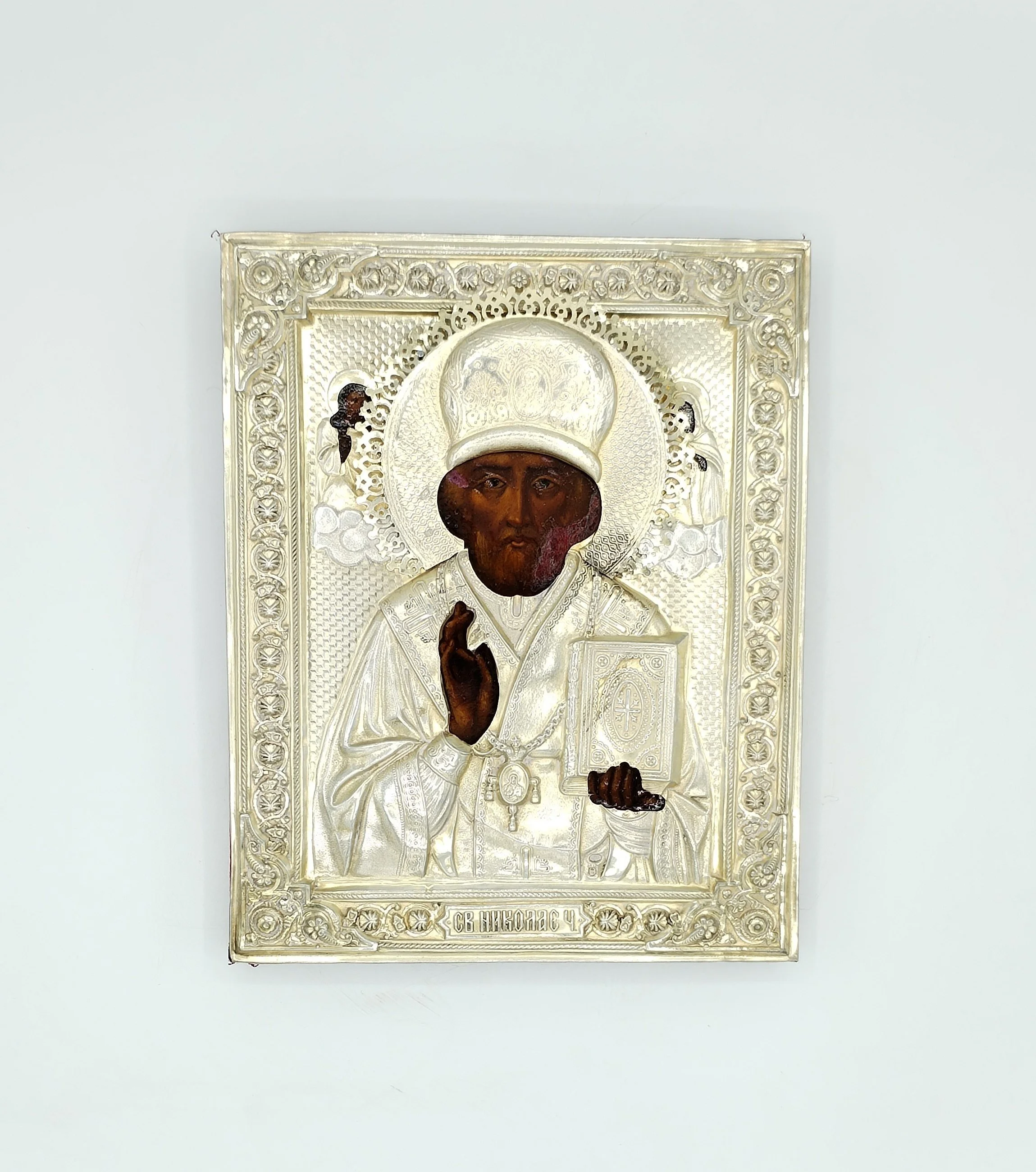 Painel de madeira com pintura e óleo e aplicações em folha de prata de 875/1000 (84 zlotniks), marca da cidade de Moscovo (1908-1926) e marca de reconhecimento.