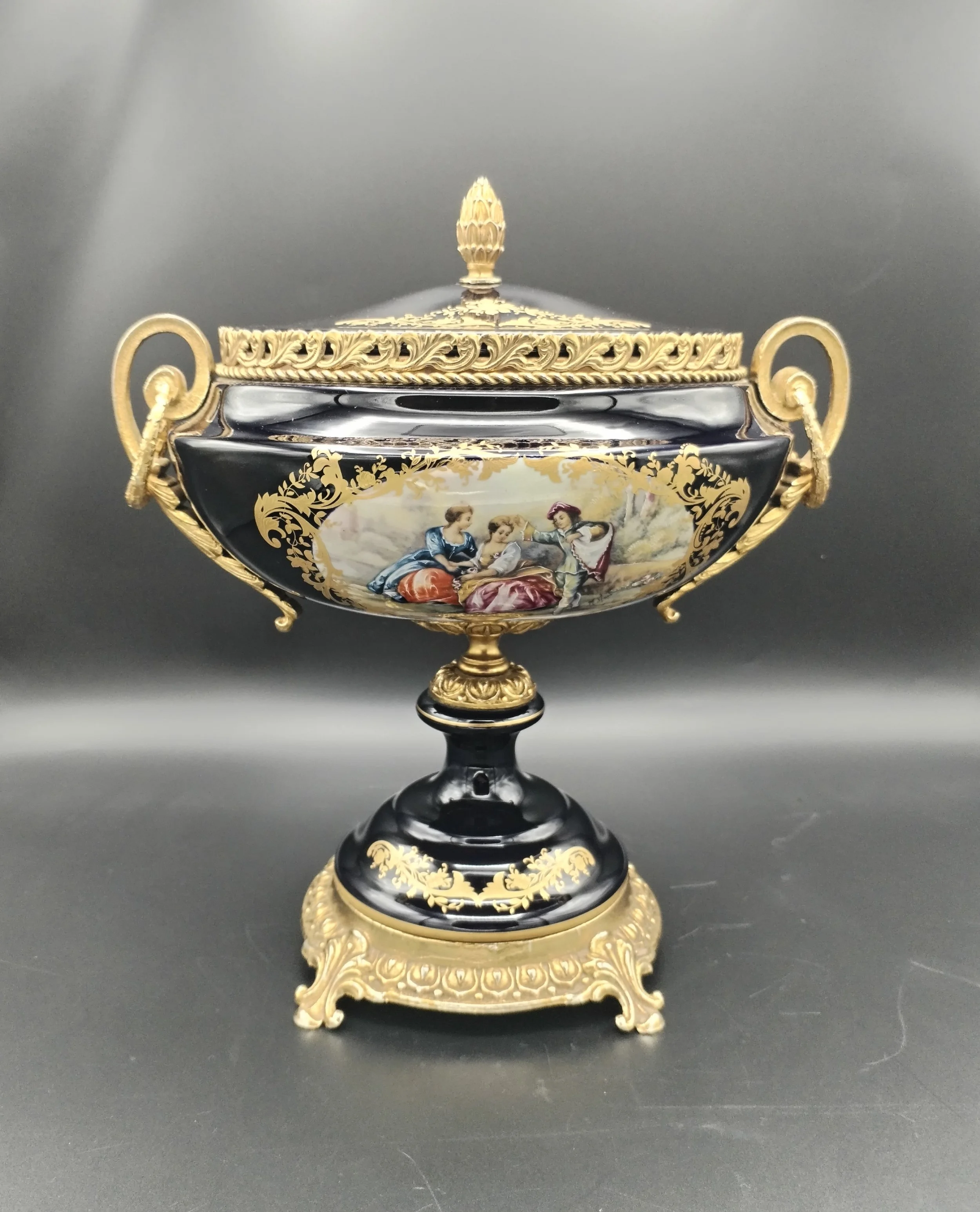Porcelana estilo Sèvres pintada à mão em montagem de metal amarelo