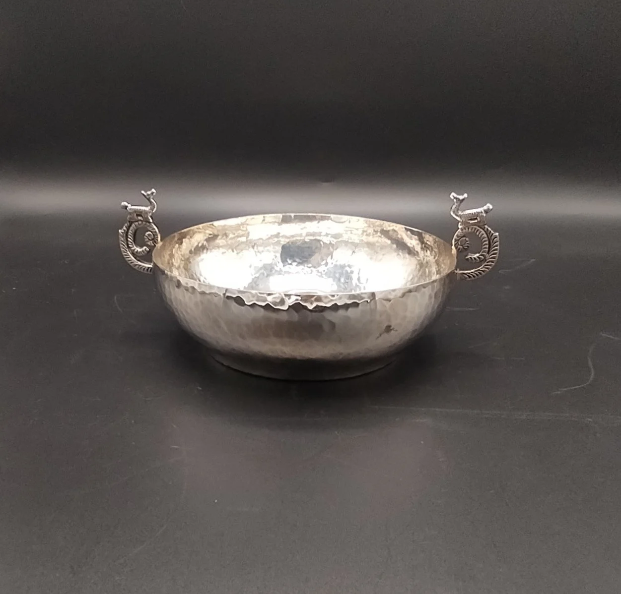 Peça feita por encomenda na Joalharia Gomes da Póvoa em prata 835/1000 e ovo de avestruz. Com contraste Águia 835 do Porto (1985-2020), da casa Gomes e de ourives do mesmo período e marcado FORNECEDORES DE SAR DUQUE DE BRAGANÇA