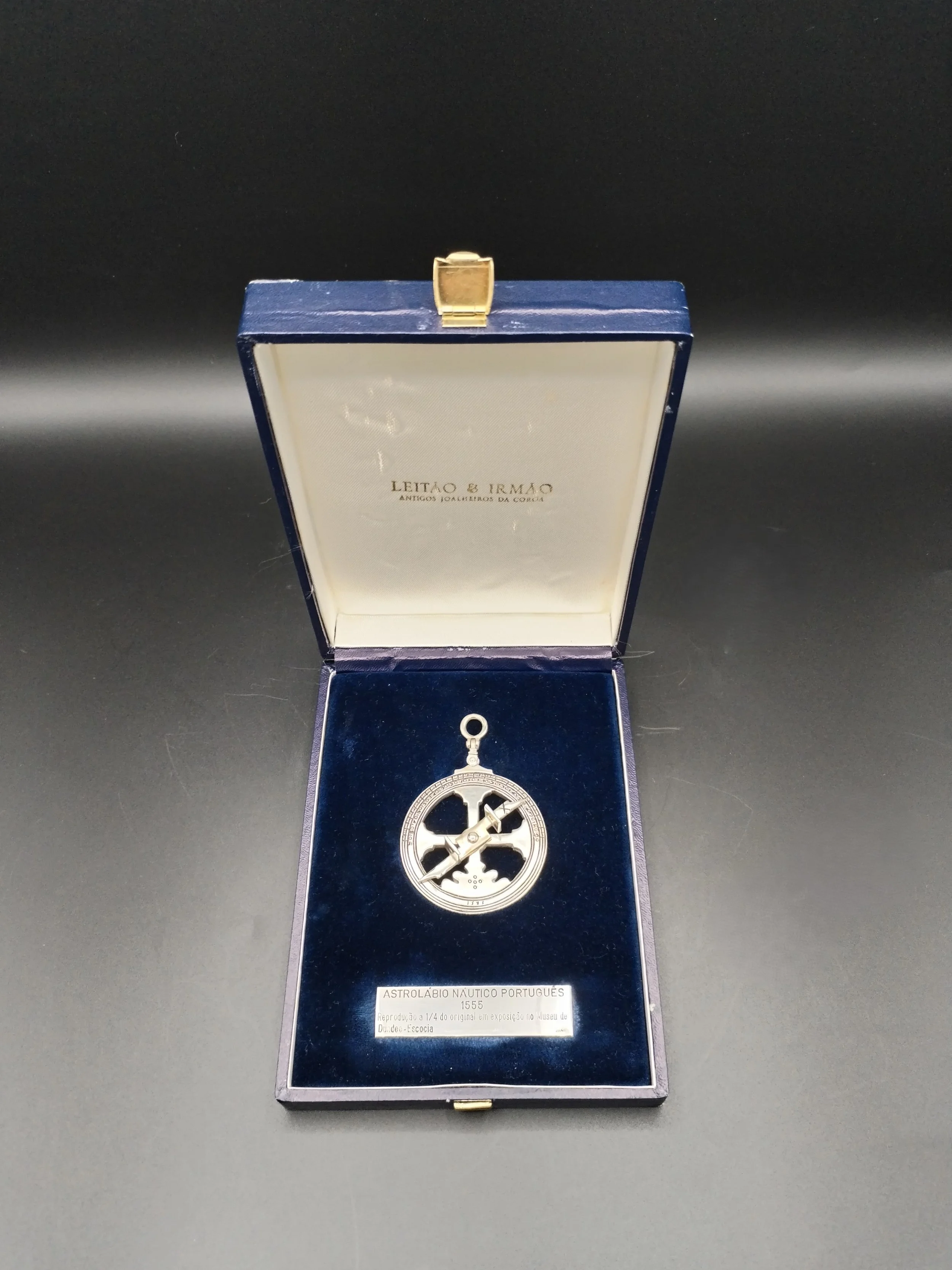 Marcado “ASTROLÁBIO NÁUTICO PORTUGUÊS - 1555 - REPRODUÇÃO A 1/4 DO ORIGINAL EM EXPOSIÇÃO NO MUSEU DE DUNDEE - ESCÓCIA - LEITÃO - DEPOSITADO - STERLING - A ANDROW SMYTON”. Com estojo.